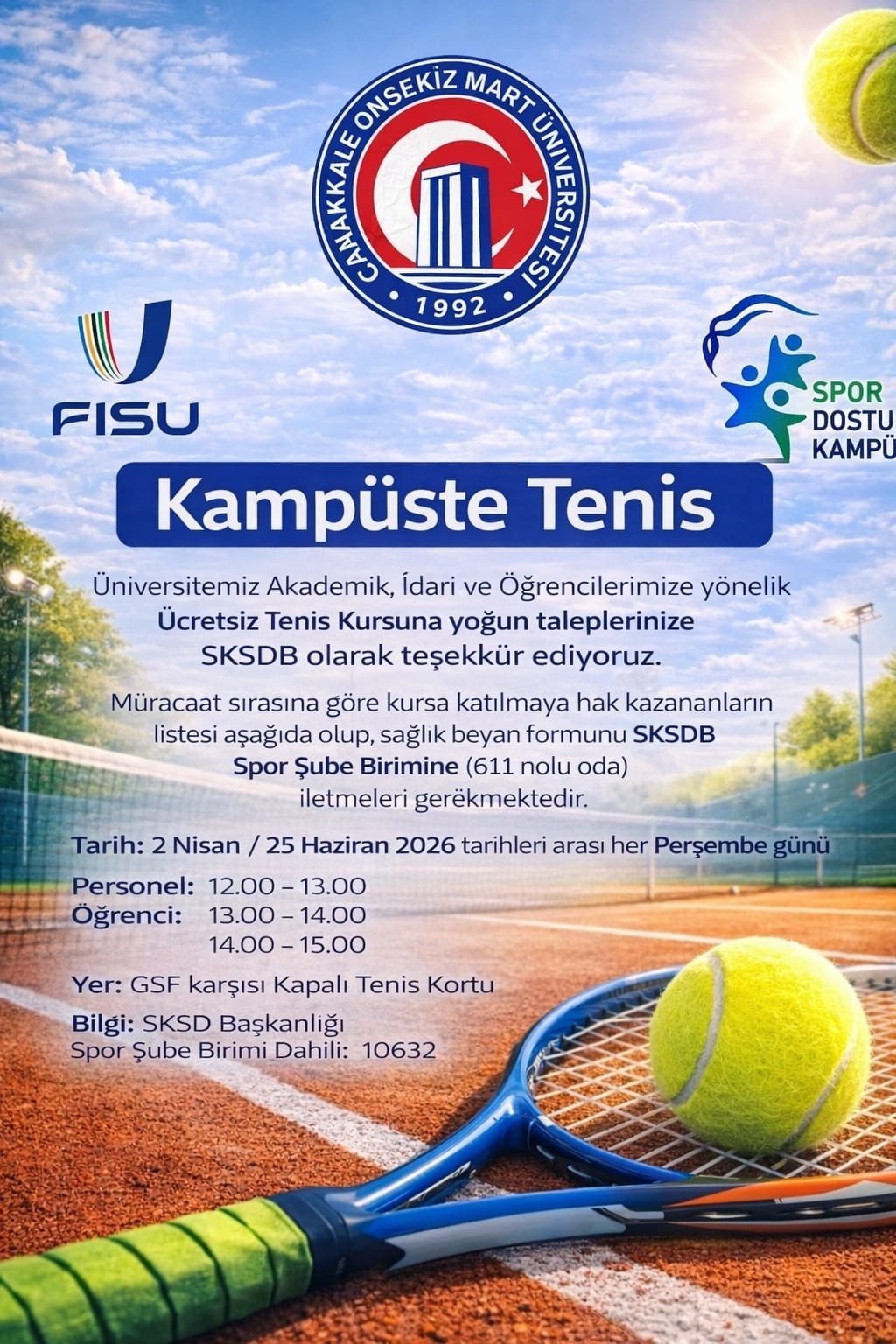 Üniversitemiz personeli ve öğrencilerine yönelik Sağlık Kültür ve Spor Daire Başkanlığı tarafından düzenlenen "Kampüste Tenis" projesine göstermiş olduğunuz yoğun ilgiye teşekkür ederiz. Kursiyerler, müracaat sırasına göre belirlenmiş olup ilk hafta katılım sağlamayan kursiyerlerin yerine başvuru sırasına göre yedek katılımcılar dahil edilecektir.Kursa katılmaya hak kazanan personelimiz ve öğrencilerimiz sağlık beyan formunu doldurarak SKSDB Spor Şube Birimine UBYS üzerinden veya elden (Rektörlük B Blok 6. Kat 611 No'lu Oda Dahili: 10632) 1 Nisan 2026 Çarşamba gününe kadar ulaştırmaları gerekmektedir.